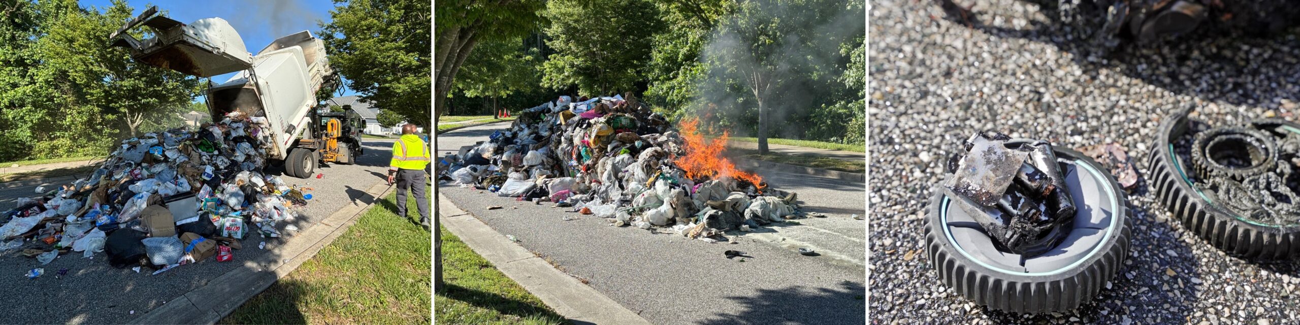 Lithium batteries tossed in household trash can ignite fires that endanger collection crews, destroy trucks, and damage recycling equipment — keep everyone safe by recycling batteries at approved drop-off sites. Photo credits: Town of Easton