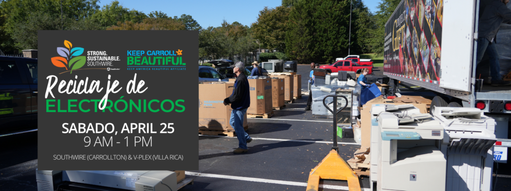 El evento de reciclaje de electrónicos de Keep Carroll Beautiful, conocido como E-Recycling, es una jornada de recolección de amnistía que se lleva a cabo dos veces al año y está abierta a todos los residentes del condado de Carroll. El evento de PRIMAVERA se realiza en Carrollton y Villa Rica, mientras que el evento de OTOÑO se lleva a cabo solo en Carrollton. Los eventos de amnistía de KCB tienen lugar los sábados entre las 9 a.m. y la 1 p.m. Visita la página de eventos de Facebook de KCB para más detalles.